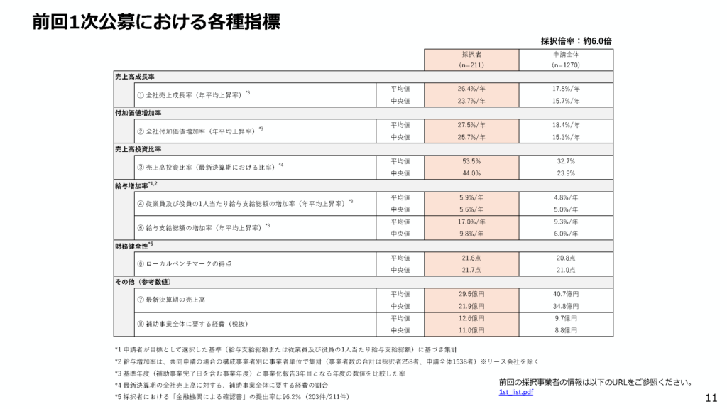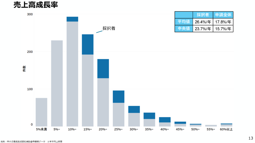 • 全社売上成長率(年平均): 申請全体の平均17.8%に対し、採択者は26.4%と、約1.5倍に相当する高い水準を記録しています 。