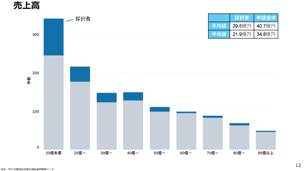 • 採択者の実像: 採択者の売上高中央値は21.9億円です。
