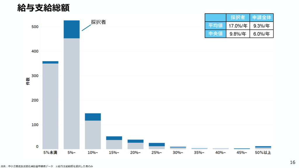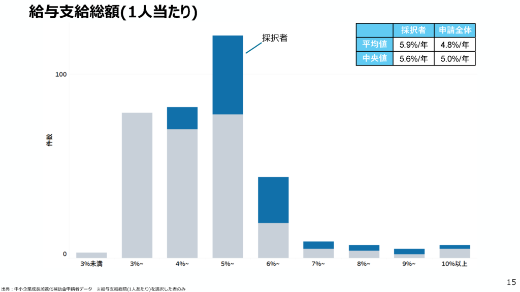 • 給与支給総額(1人当たり)の上昇率: 採択者の平均値は年平均5.9%となっており、申請全体の4.8%を上回っています