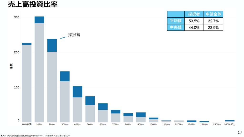 • 驚異的な投資比率: 採択者の平均投資比率は53.5%に達しており、申請全体の32.7%を大きく引き離しています