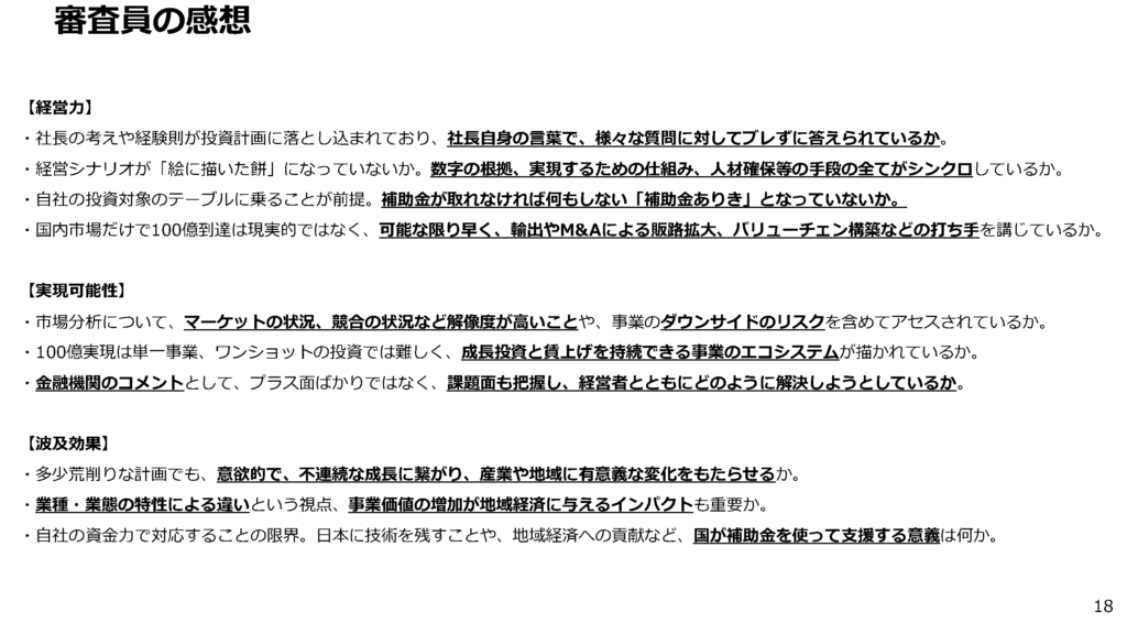 • 審査員の視点: 「経営シナリオが絵に描いた餅になっていないか」という点が厳しく問われます 。