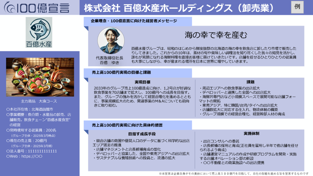 これは自社のビジネスモデルを再定義し、「売上高100億円」という高い目標に向けて経営者が自らの覚悟を公に宣誓する、成長戦略のスタートラインです。